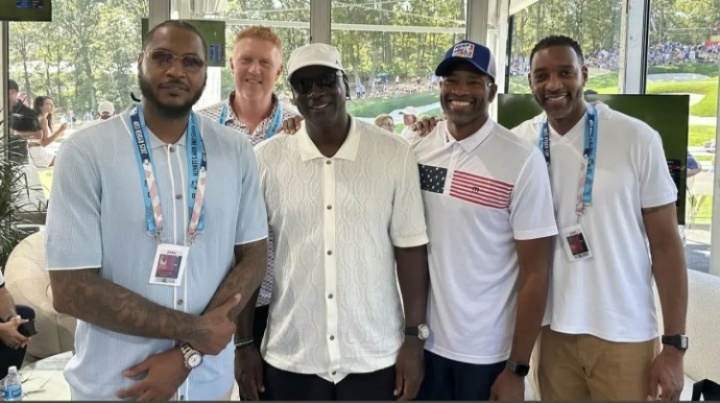 体育资讯9月29日讯 今日,NBA传奇球星迈克尔-乔丹、卡梅隆-安东尼、特雷西-麦克格雷迪、文斯-卡特和布莱恩-斯卡拉布赖恩现身贝斯佩奇黑球场,参加莱德杯第三天的比赛!