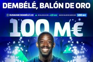 体育资讯10月10日讯 德国足球转会市场更新了法甲球员身价,28岁的巴黎前锋登贝莱身价上涨到1亿欧元,自2019年后身价再次突破1亿大关。