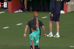 比赛补时阶段,弗里克不满裁判,两黄变一红被罚下!